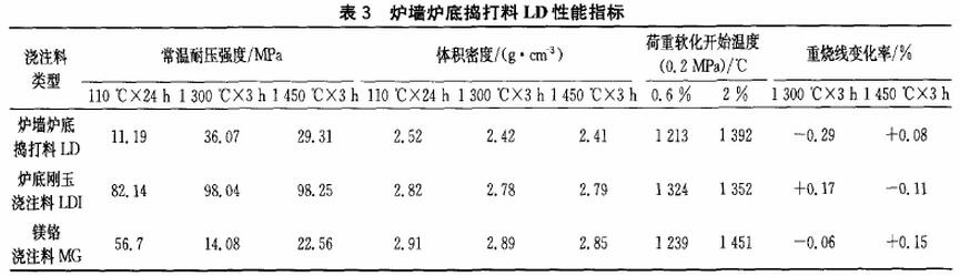 爐墻出現(xiàn)變形,中間縮窄,底部變寬,容易出現(xiàn)開(kāi)裂:爐底出現(xiàn)大量的氧化鐵渣堆積,影響生產(chǎn)。其所用澆注料、搗打料的性能如下表: