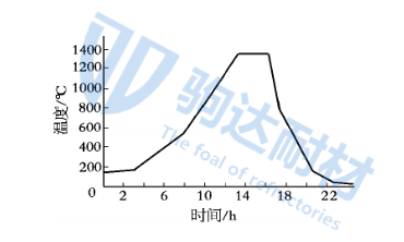 磚坯干燥后用隧道窯燒成,溫度控制在(1400±10)℃,燒成周期為24h,保溫4h,推車時間間隔為60min,燒成曲線如圖1。